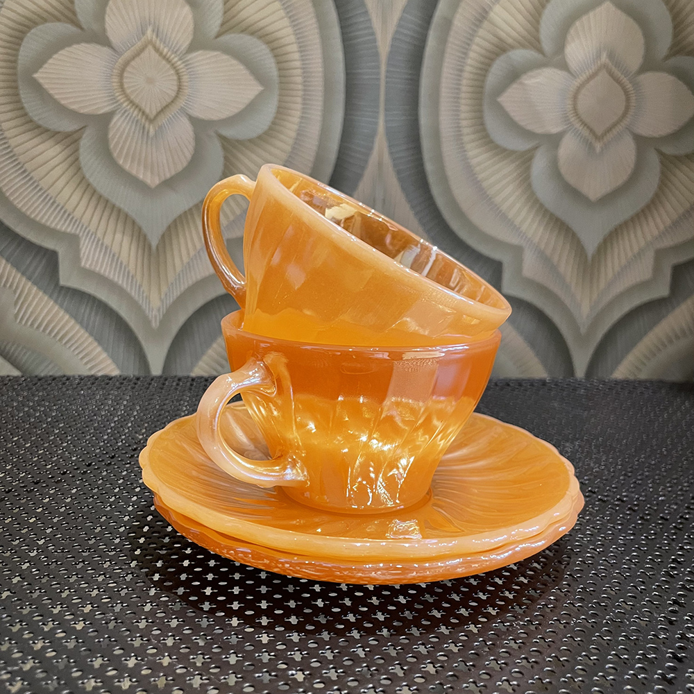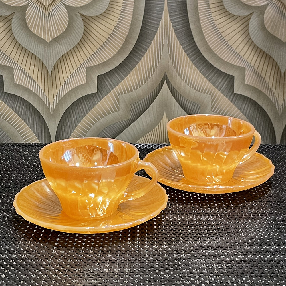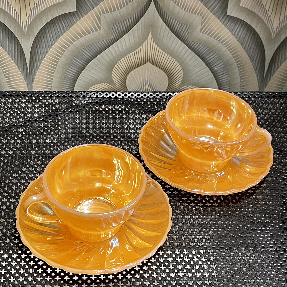 Anchor Hocking tea cups from 60s, in orange color. Made in USA. Pre loved, in very good condition. Set of 2.