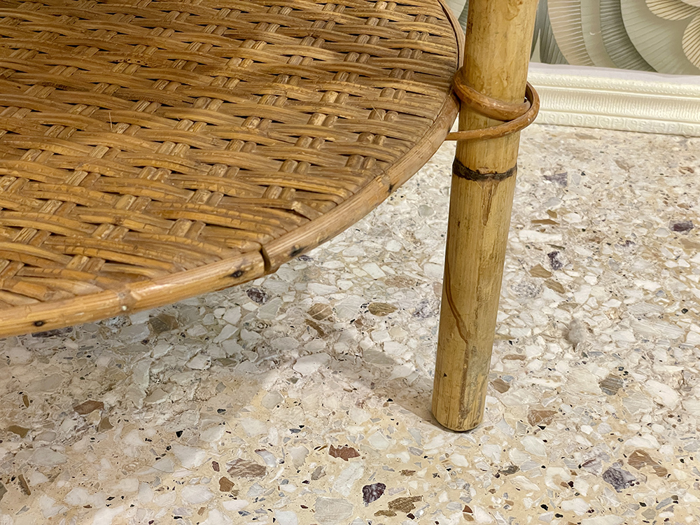 Original bamboo furniture frame with rattan mat on the top and the shelf below.