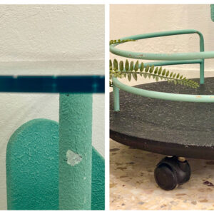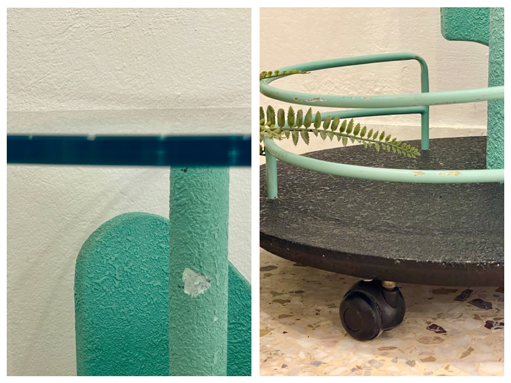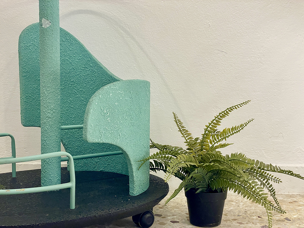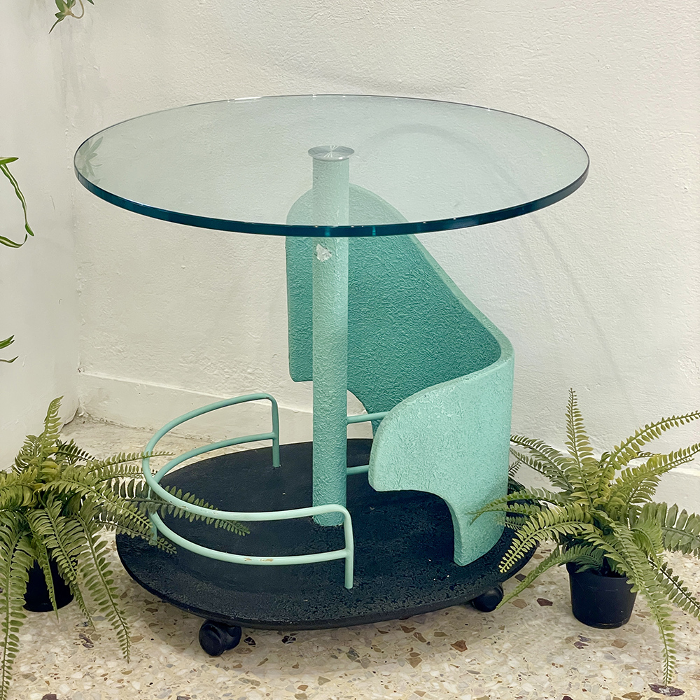 Rolling mini bar or side table in Memphis style, featuring a wooden base and a distinctive design in vibrant mint green combined with black. The top surface is made of round glass.