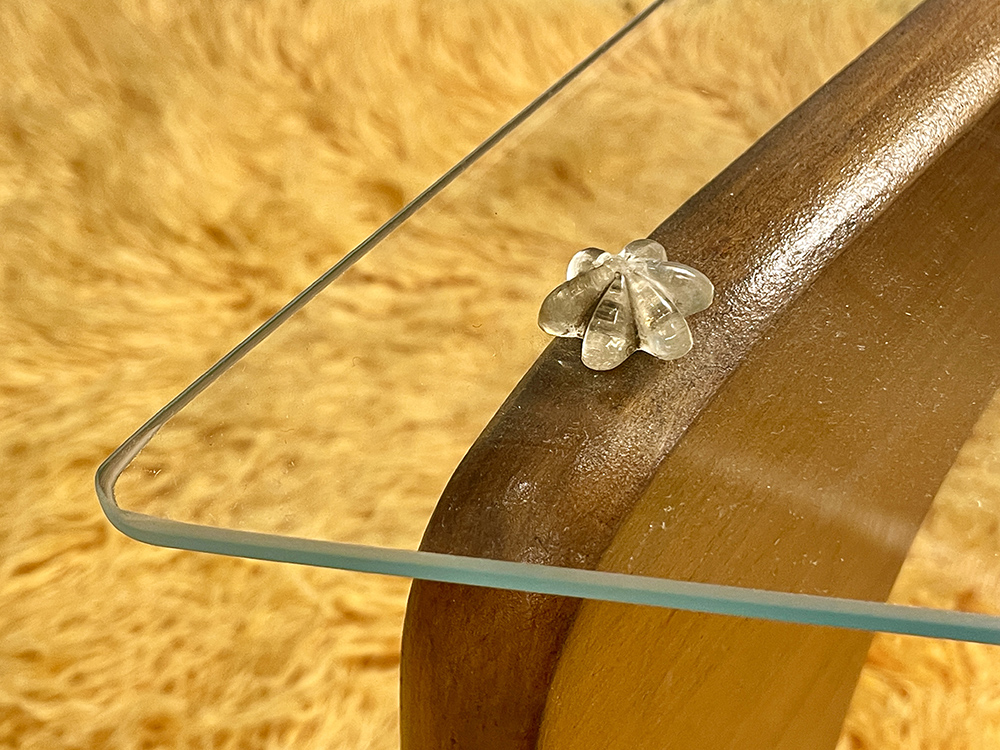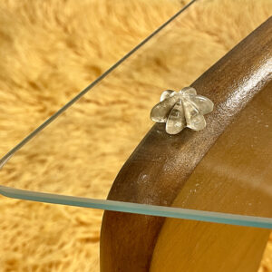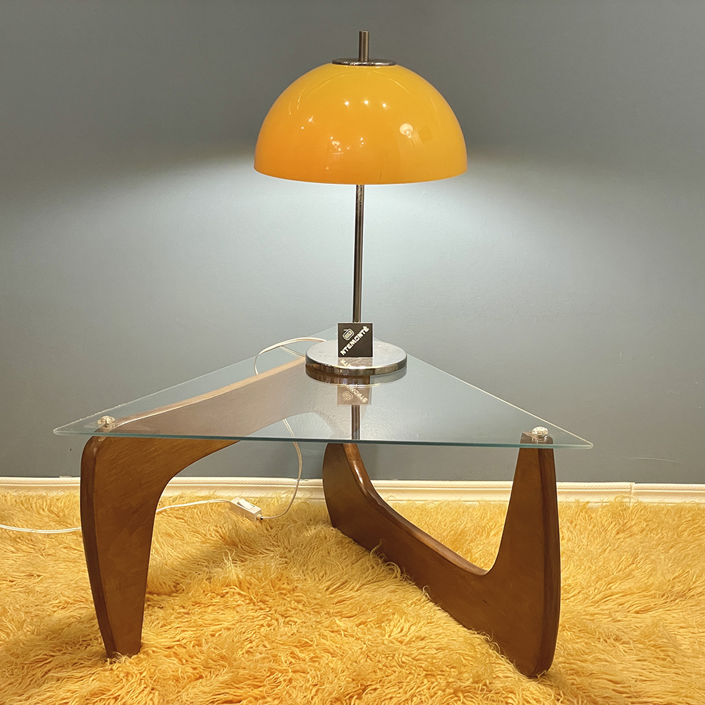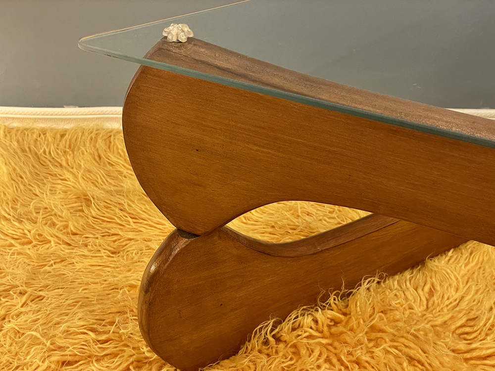 A rare Mid Century piece in a walnut finish, faithfully capturing the iconic Noguchi design in a more compact scale than the original. It features the signature sculptural base, while the 0.5cm thick equilateral triangular glass top is secured by three unique flower-shaped supports. The table has undergone a complete restoration, highlighting its timeless aesthetic and exceptional craftsmanship.