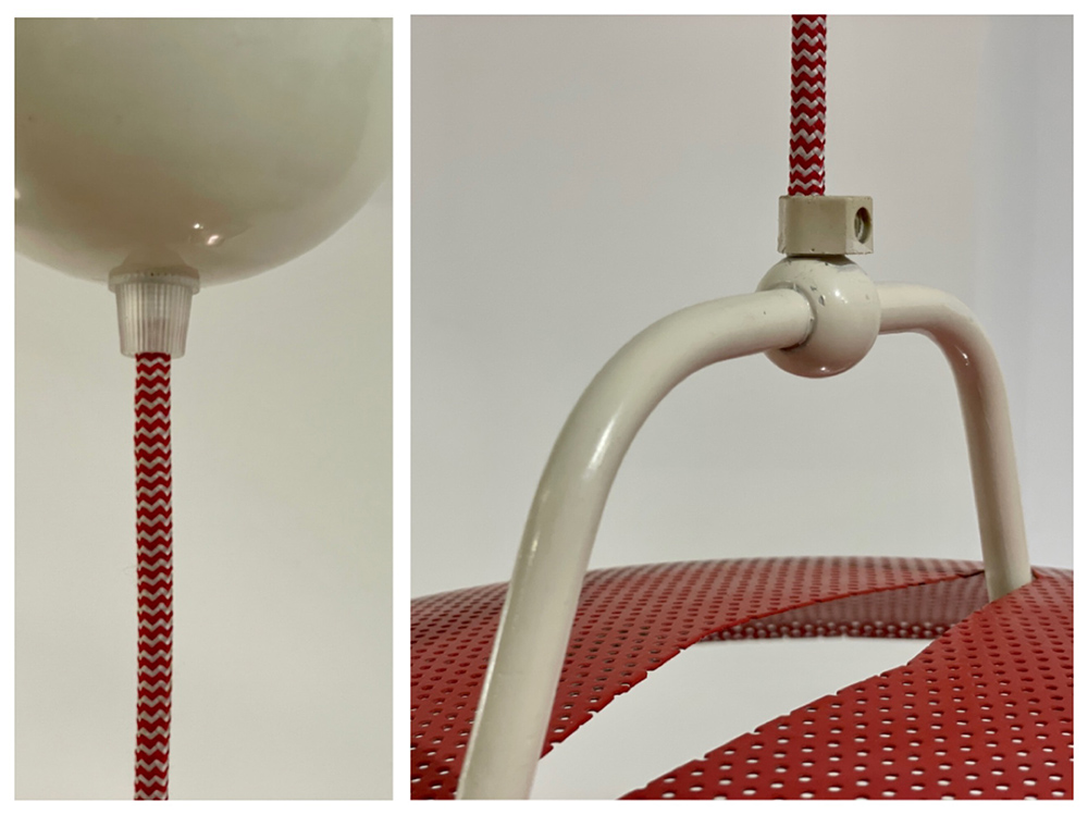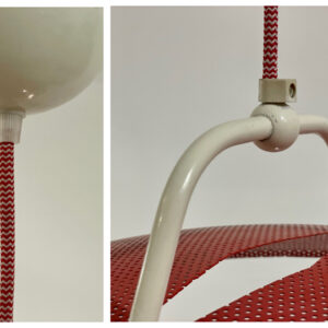 Metal ceiling light in bright red color, featuring a mushroom-shaped shade and geometric structure inspired by 80s Memphis design. Comes with a red-and-white fabric cord.