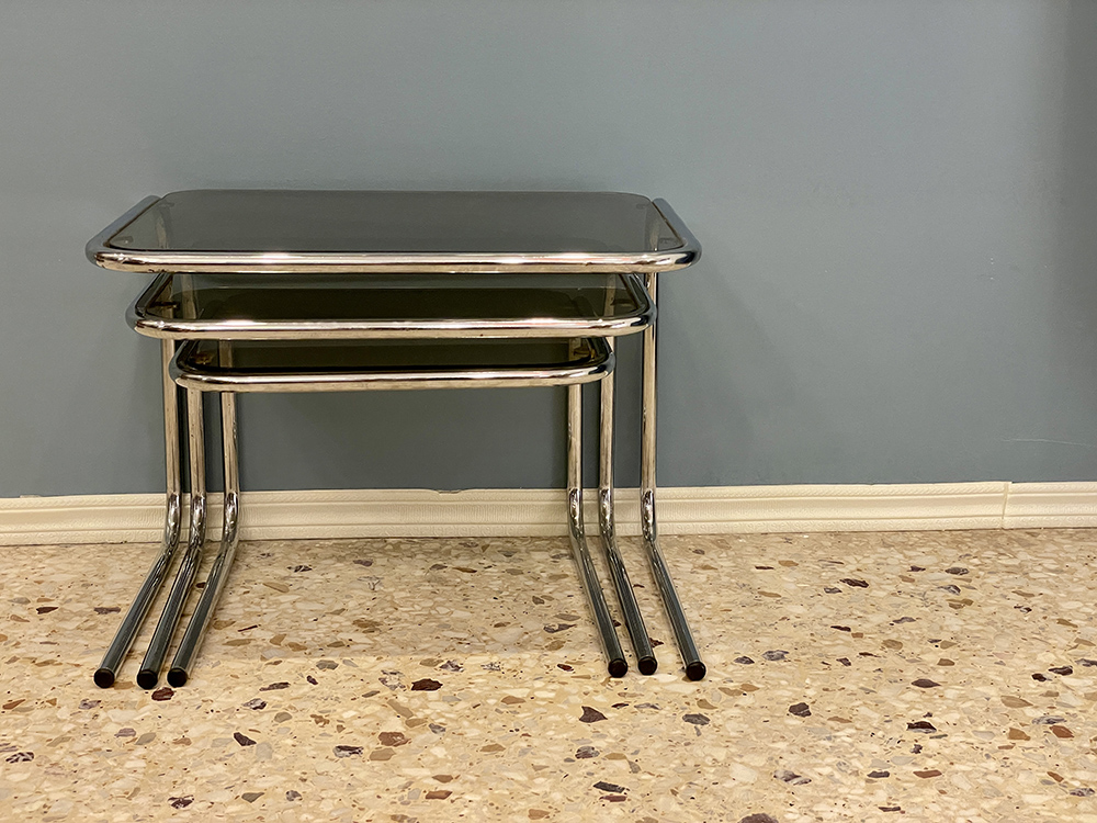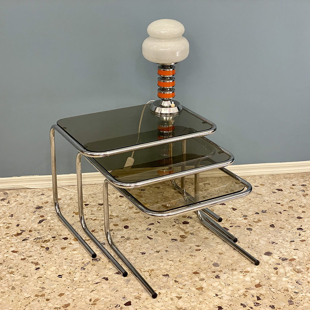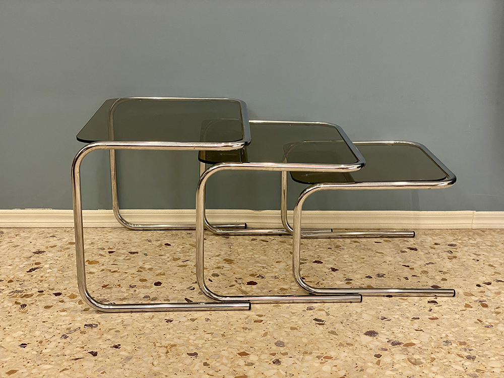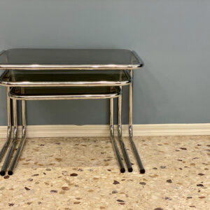 Featuring a characteristic High-Tech/Bauhaus design with a Chrome-plated frame and Smoked Glass tops. Ideal for functional use and a minimalist aesthetic.