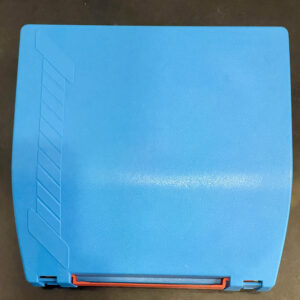 Plastic material in bright colours (red-blue-white) and upper case with carrying handle.