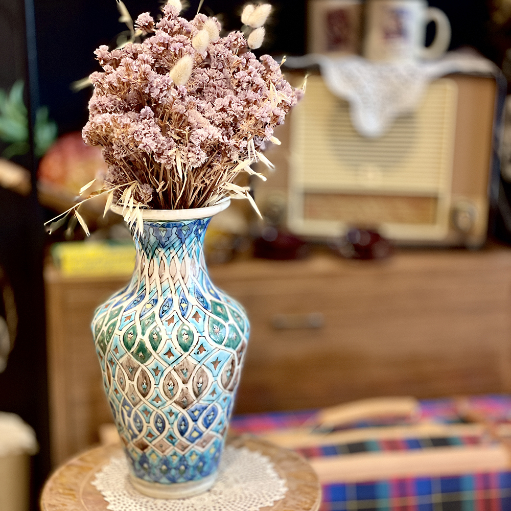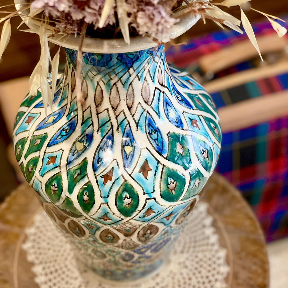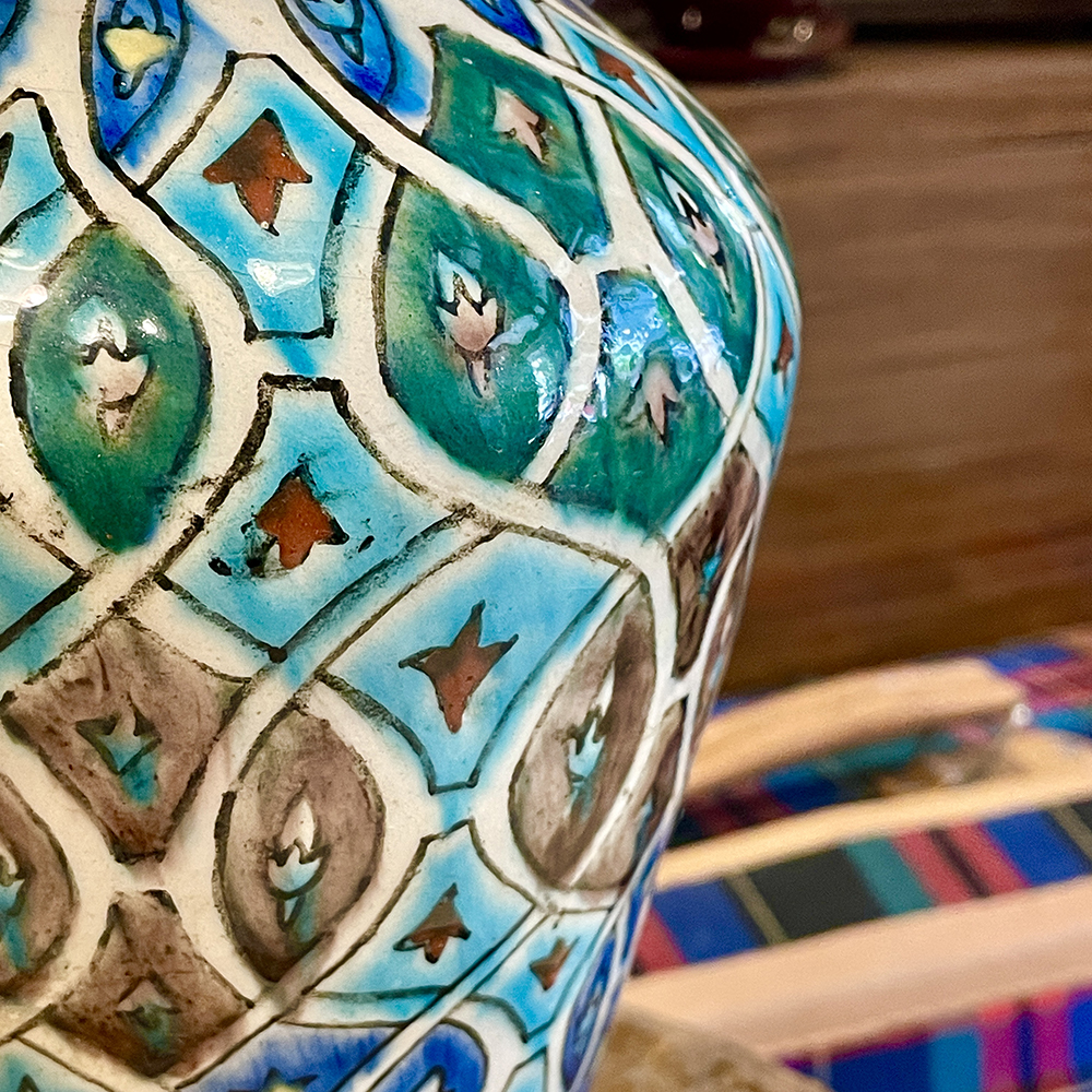 Κεραμικό βάζο του 1940, με χειροποίητες ζωγραφισμένα επαναλαμβανόμενα σχέδια σε αποχρώσεις μπλέ, πράσινο, καφέ και μαύρο.