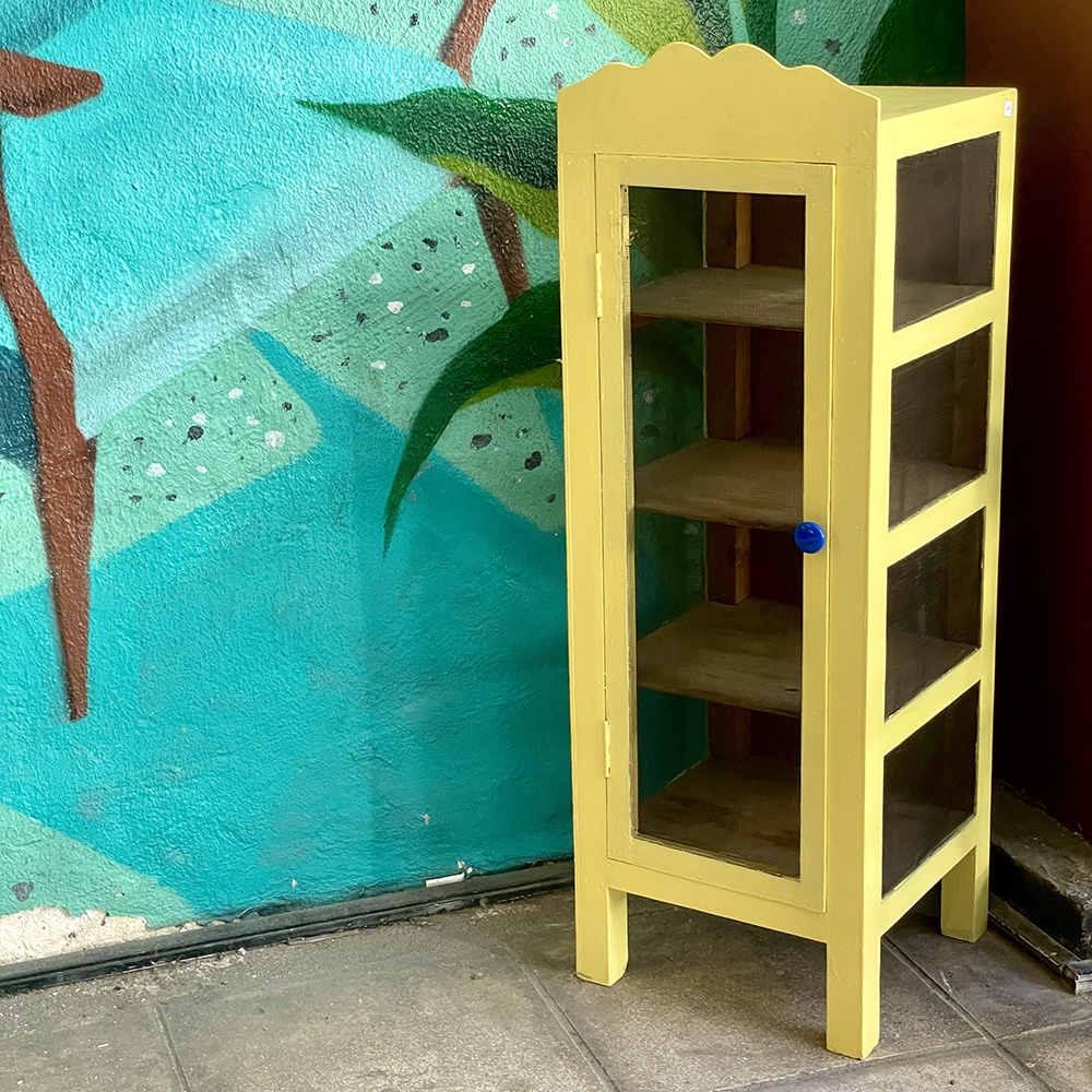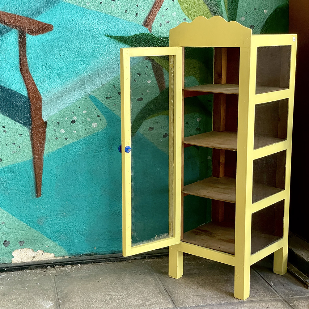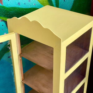 Κίτρινος, ξύλινο φανάρι  για αποθήκευση τροφίμων με 4 επίπεδα και σίτα ,από τα 40s.