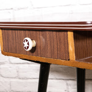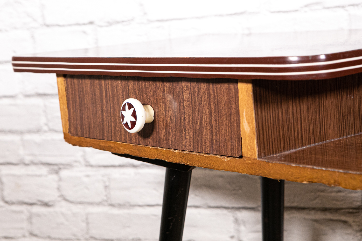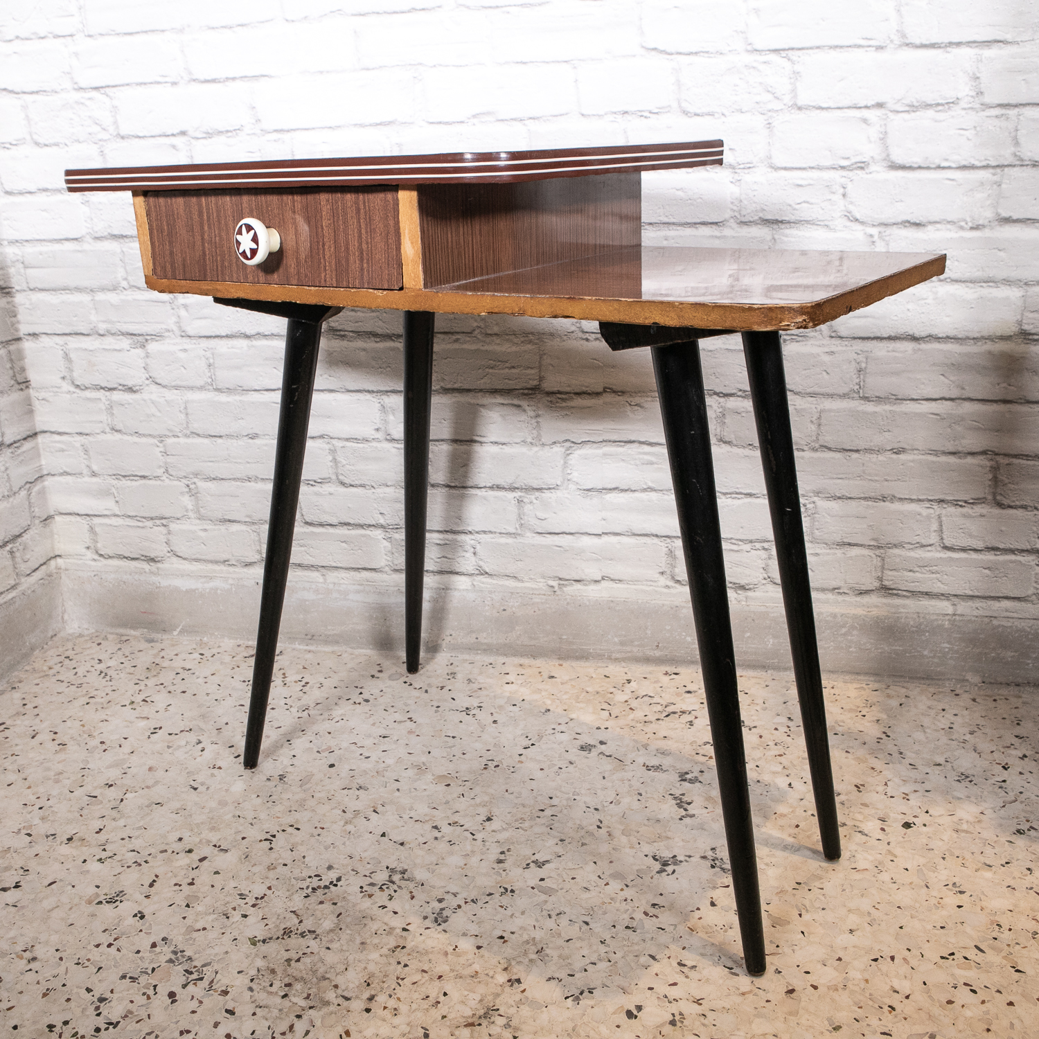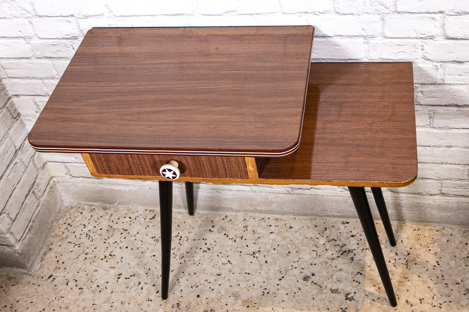 Κομοδίνο/ βοηθητικό τραπεζάκι με δύο επίπεδα και συρτάρι, δεκαετίας 1960. Σε πολύ καλή κατάσταση.