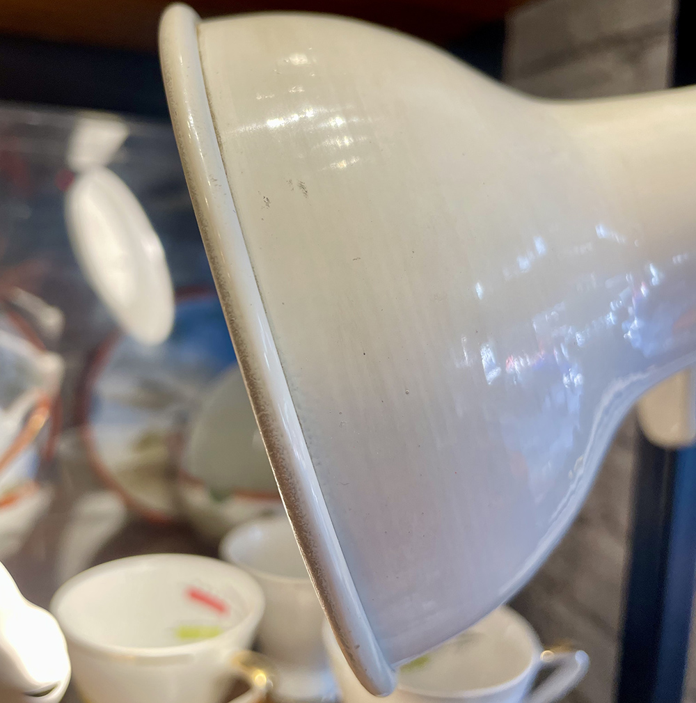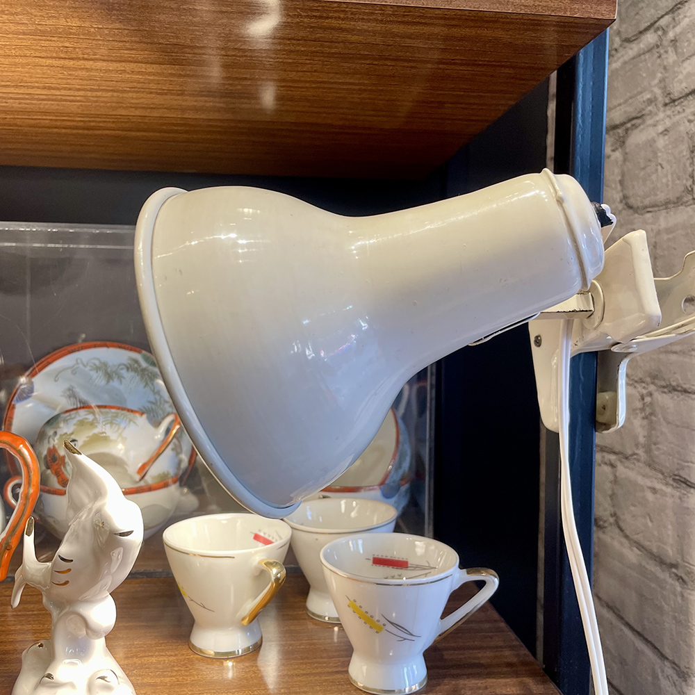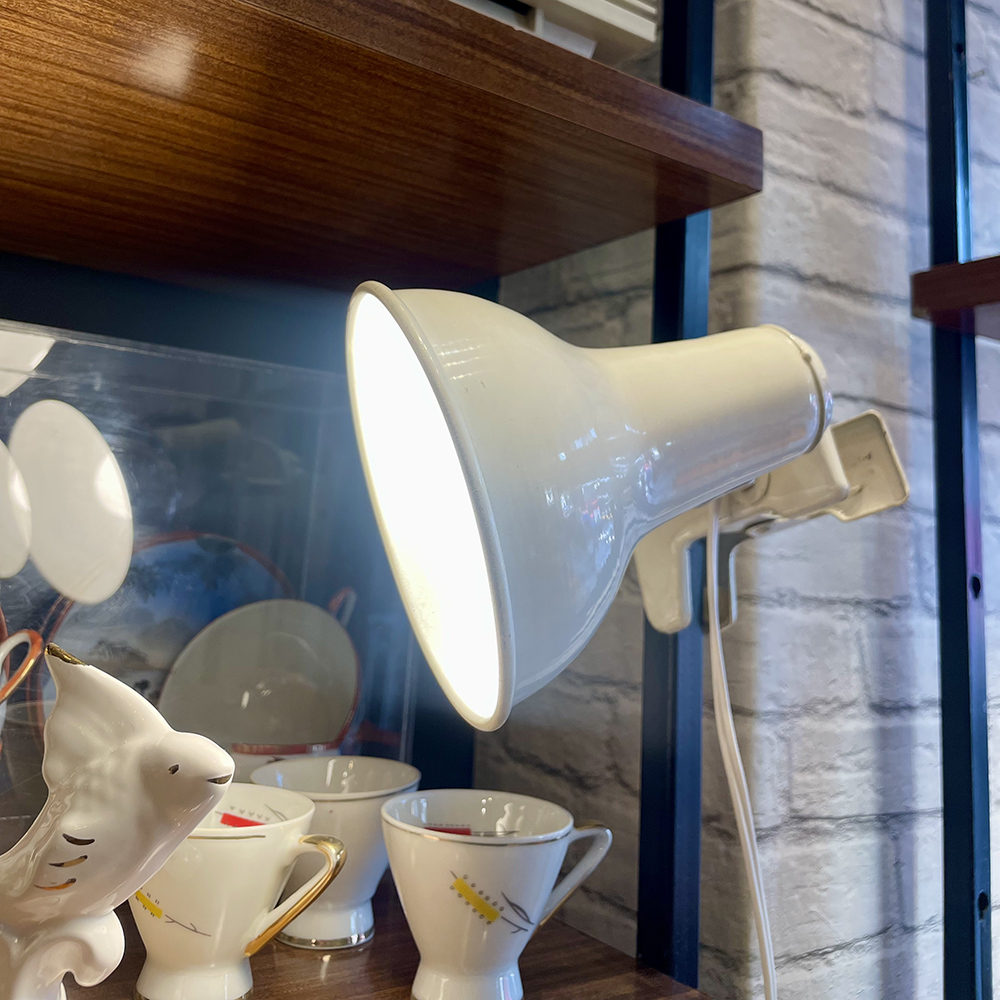 60s μεταλλικό λευκό προβολάκι με βάση κλιπ. Σε πολύ καλή κατάσταση με μικροφθορές λόγω παλαιότητας.