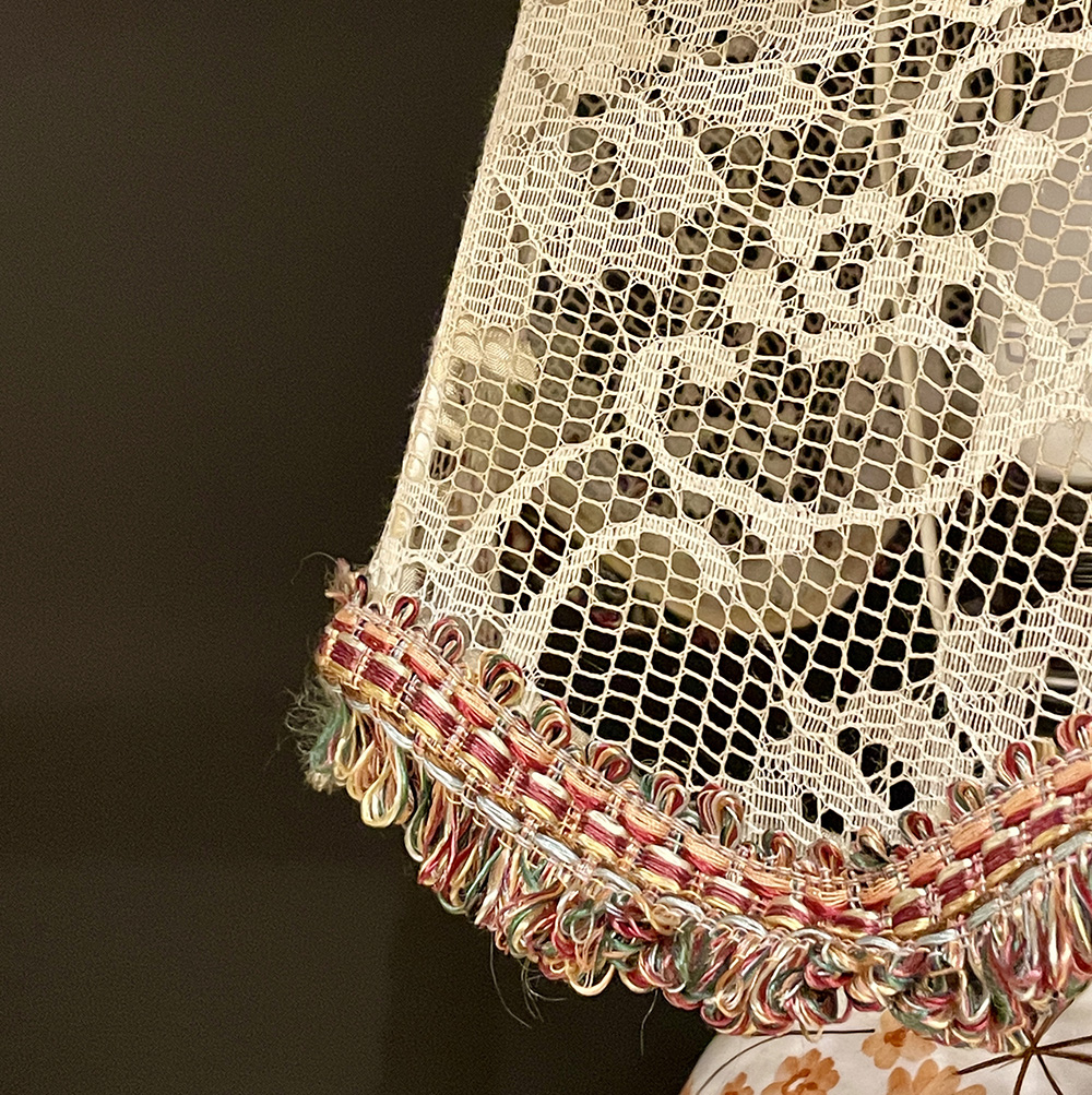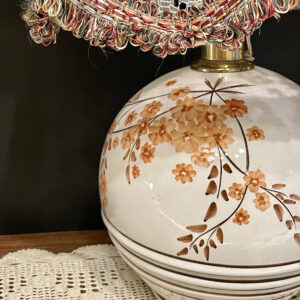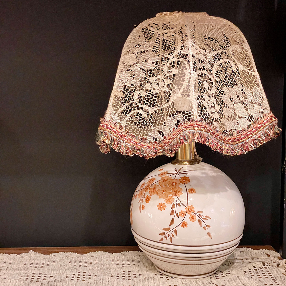 Επιτραπέζιο πορτατίφ με ιβουάρ δαντέλα και χρωματιστά κοντά κρόσια στο abat-jour, κεραμική βάση με ζωγραφισμένα λουλούδια σε καφέ και πορτοκαλί αποχρώσεις.