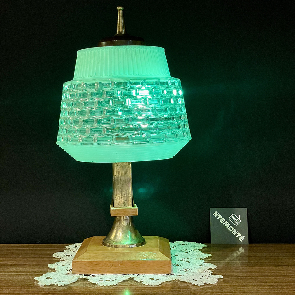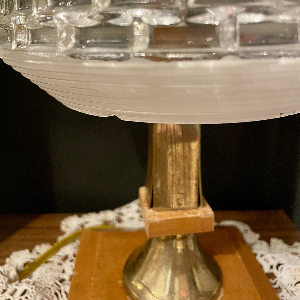Mid Century, μικρό πορτατίφ με ξύλινη βάση, χρυσές λεπτομέρειες και γυάλινο καπέλο.