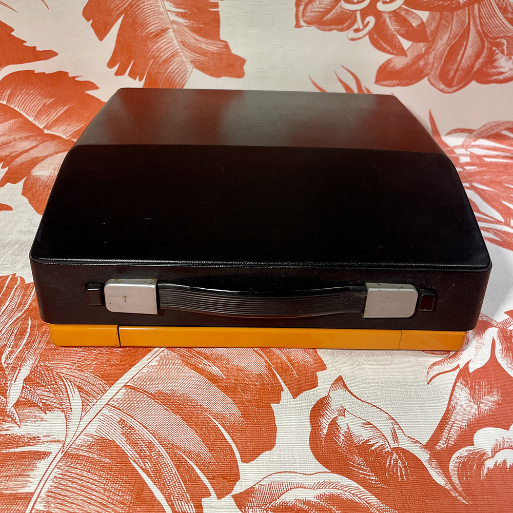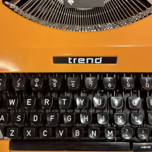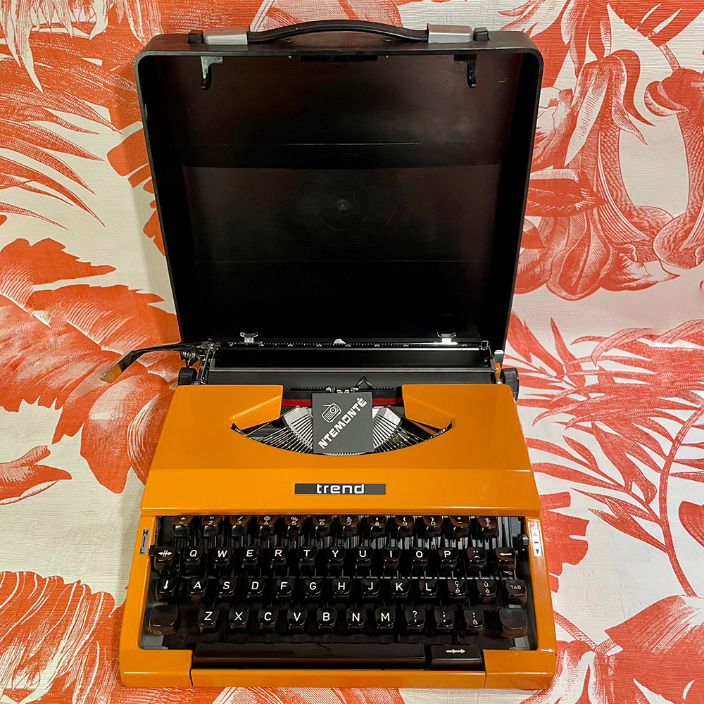 Vintage γραφομηχανή της εταιρείας Trend, σε έντονο πορτοκαλί χρώμα, με λατινικούς χαρακτήρες και μαύρο καπάκι με λαβή.